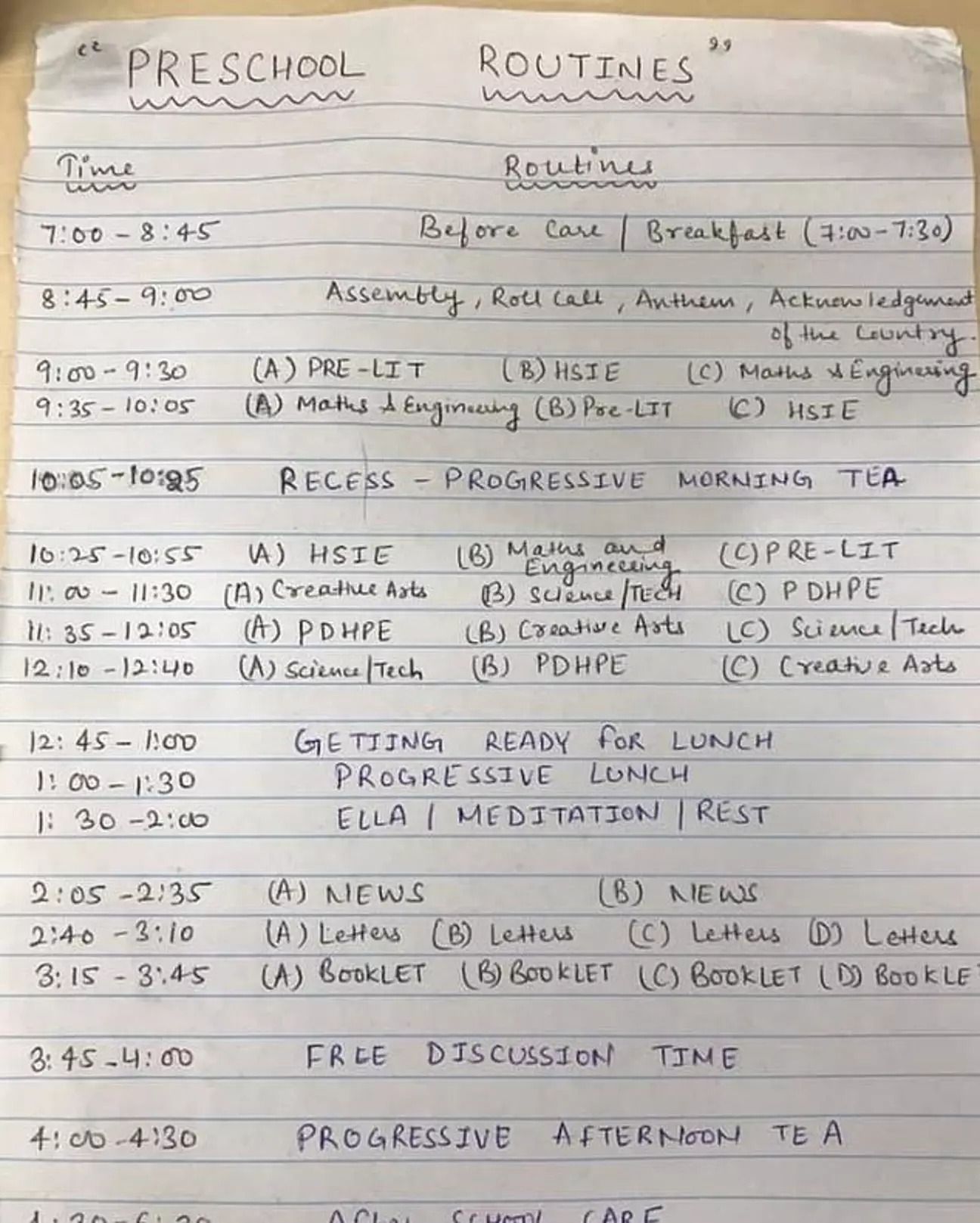 There’s then “free discussion time,” a “progressive afternoon tea” and after-school care to wrap up the day.