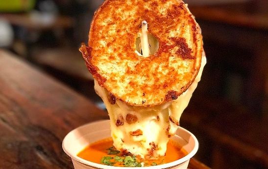 A limited edition treat currently being served in small quantities at Clinton Hall, “The Flamin’ Hot Doughnut Grilled Cheese” consists of the following: a habanero glazed bacon doughnut, halved and stuffed with mozzarella.