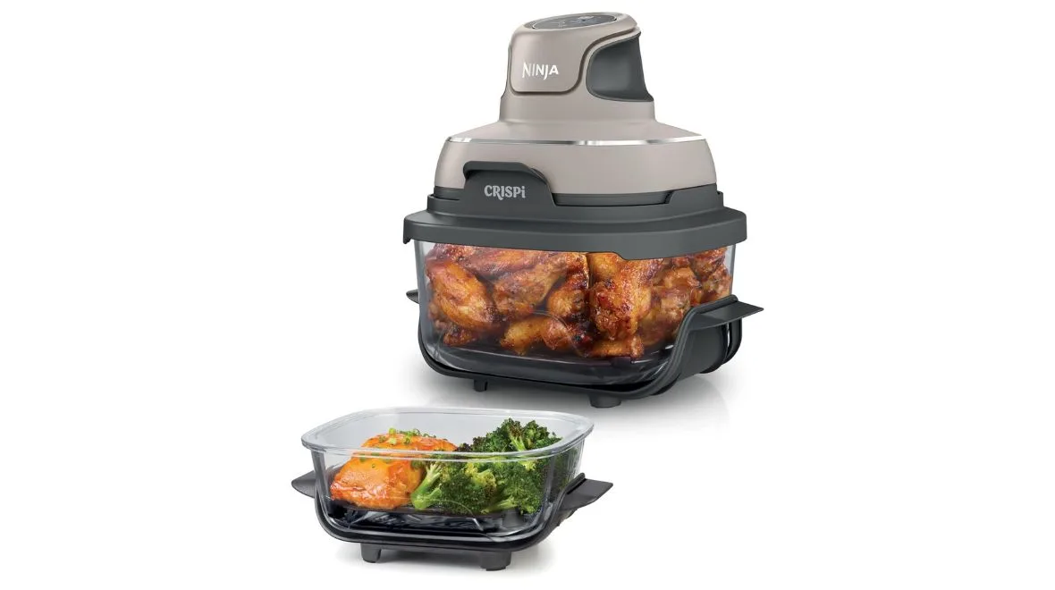 The Ninja CRISPi comes with two CleanCrisp glass containers measuring 1.4L and 3.8L capacity, both featuring non-stick surfaces and being dishwasher safe for easy cleaning.