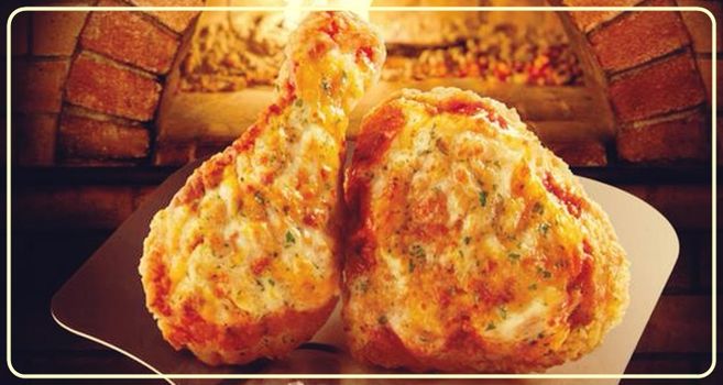 A melding of KFC’s Original Recipe fried chicken thighs and drumsticks and a marinara pizza, the finished piece of chicken is covered in a tangy tomato sauce and dunked in breaded cheddar and mozzarella,