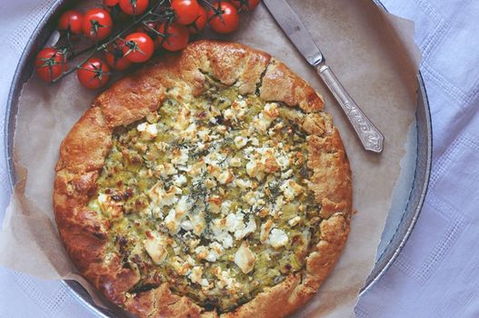 Spread the leek mixture on top of the rolled out pastry disc. Leave a 2” border around the edges. Pleat the pastry edges up over the filling so it forms a crust and holds in all the filling. Sprinkle the feta over the filling. Brush the edges of the pastry with the remaining beaten egg and bake for 25-30 minutes until the pastry is golden and the filling gently set. Garnish with fresh thyme sprigs.