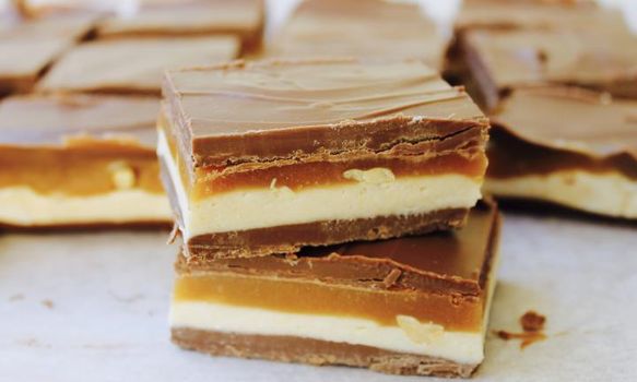 - Put the caramels and cream into a saucepan and melt over a medium heat until it is all smooth and combined. Pour the caramel layer on top of the sticky marshmallow dough layer.