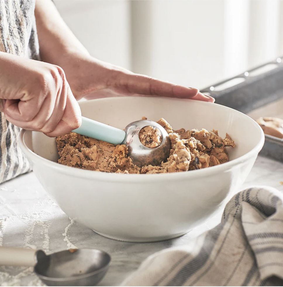 - Using a cookie scoop, scoop up small balls of cookie dough onto a baking tray lined with non-stick lining and place in the oven. Cook them in batches or on multiple trays.