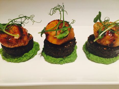 Put three spoonfuls of the pea puree on a plate. Place a slice of black pudding on top of the puree. Top that with a scallop and then place some pea shoots on top.