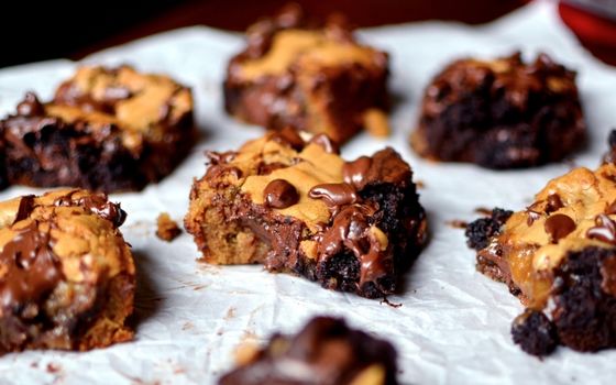 Cut cookie dough fourths; cut each fourth into four slices. Place slices over partially baked brownie batter. (Spaces between cookie dough pieces will spread during baking to cover top.)