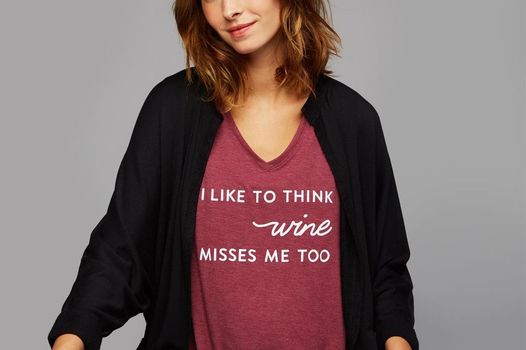 Longoria, who announced back in December that she is having a baby with husband Jose Baston, holds up a t-shirt with the caption “I like to think wine misses me too.”