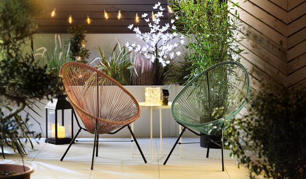 These poly-rattan round wicker chairs have a steel frame and an ergonomically shaped back rest. They’re UV-resistant for up to around 300 hours. Both sizes are available in orange, bamboo look or muted green, so you can match with your little ones.