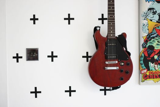 Gimme a wall! My kingdom for a blank wall! Anyway, after searching high and low, I found it … the Bear’s ‘man-cave’. It’s fairly tame decor-wise, he’s got his comic-book artwork on the walls and his guitar but apart from that, we’re talking whitewash city. The perfect canvas – HUZZAH!