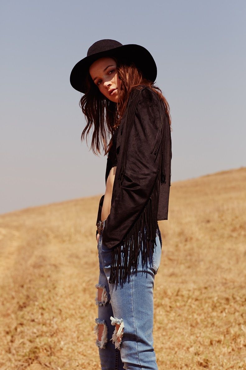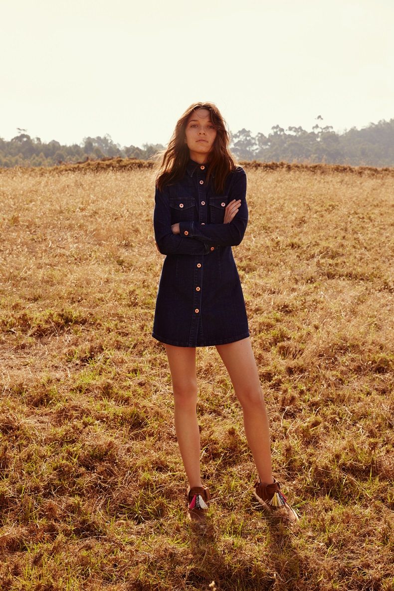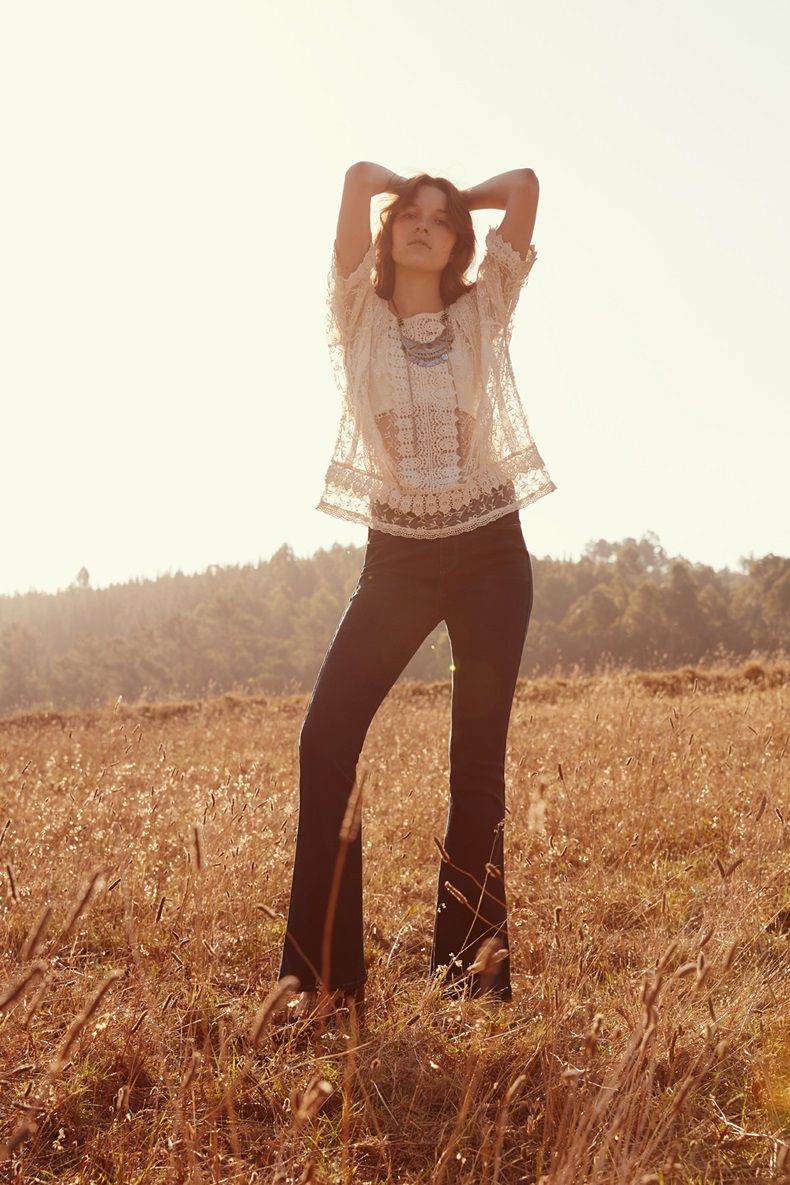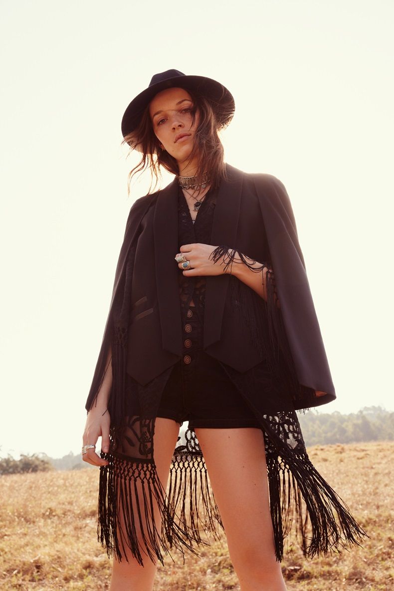 The look combines the rough with the smooth, pairing bold denim flares with delicate lace blouses and mannish check shirts, with heavy belts and boots with cute fringed minis and delicate jewellery.