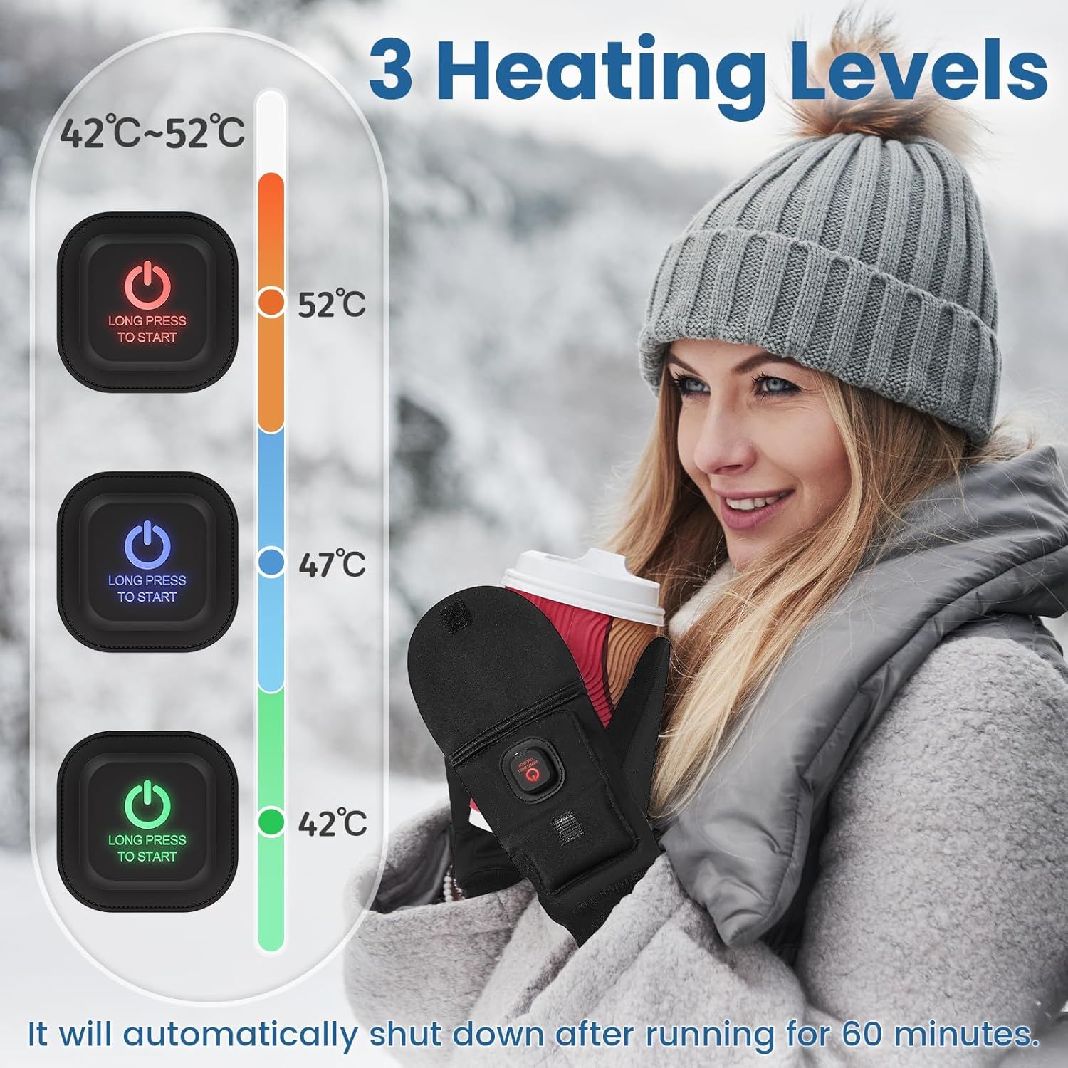 The heated mittens have three heat settings (42°C/47°C/52°C) that can be adjusted to suit your needs, and they automatically shut-off after 60 minutes of use.