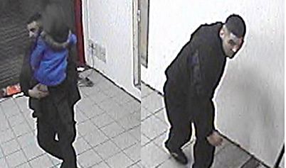 Police in the UK have released this CCTV image of four men (and one oblivious small child) suspected of stealing a pallet of sweets from a West Midlands building.