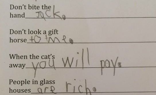 Kids, they say the funniest darn things. And write them too, and this child’s homework of finishing famous proverbs is really making us chuckle today.