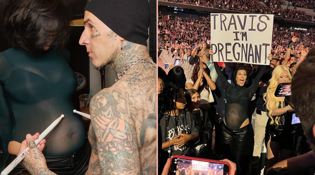 Making reference to the band’s All The Small Things music video, Kourtney held up a sign that read “Travis, I’m pregnant.”