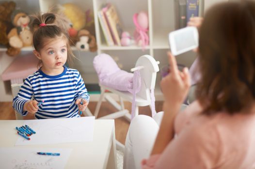 Newborn yawning child with mother