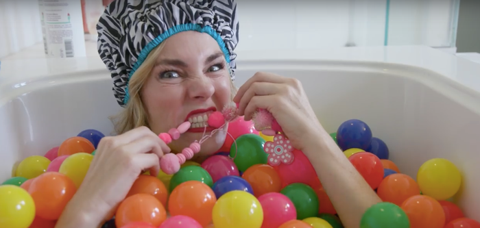 She dances around the house with smudged lipsticks, back brushed hair and even falls into a ball-pit and talks about all the chores that never get done, highlighting the full time job of being a mom with little kids.