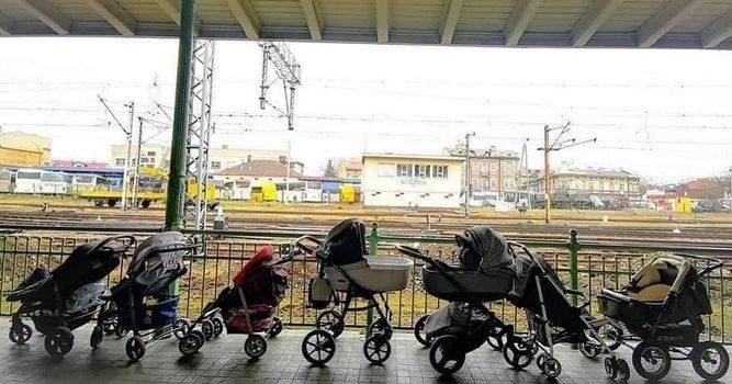 Images like the one above are becoming common in Poland as Polish parents have been arriving at train stations to donate prams to Ukrainian mothers arriving with small children.