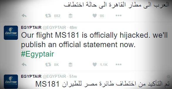 Our flight MS181 is officially hijacked. we’ll publish an official statement now. #Egyptair
