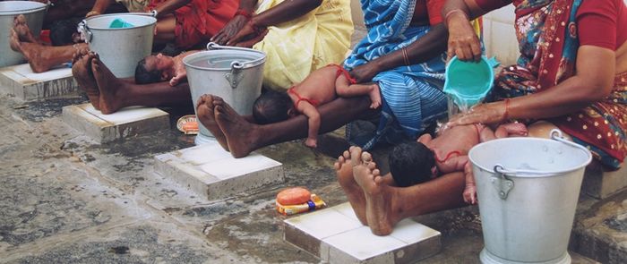 Generally performed by a ‘maalishwali’ or baby masseuse, often hired by families to provide daily bathing and massage for both baby and mother in the days following the birth, the bath involves a variety of stages, from an oil massage and powdered dal body scrub to a good soaking and soaping; to the final stage, where the baby is ‘smoked’ dry over warm embers containing caraway seeds and incense, something older Indians believe wards off colds and Flu.